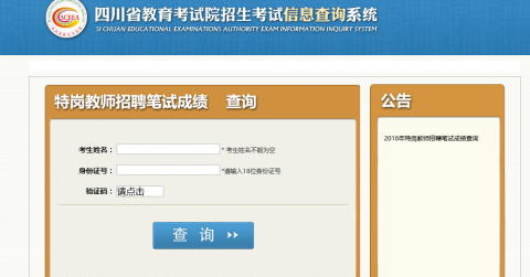 2017四川特岗教师 笔试成绩查询入口网站为四川省教育考试院网(http://www.sceea.cn ),笔试成绩查询时间为6月20日至7月30日。