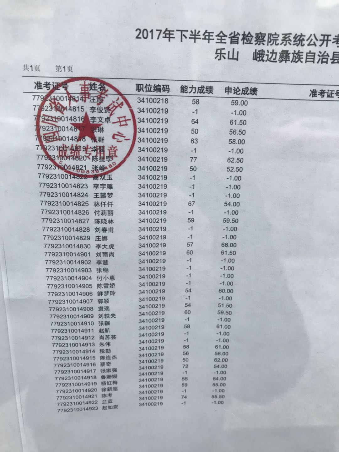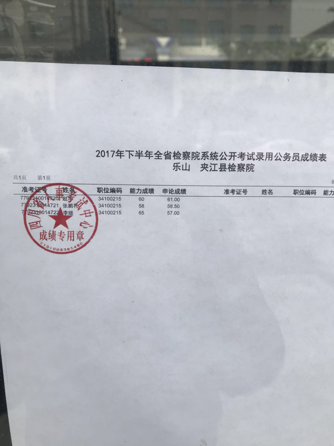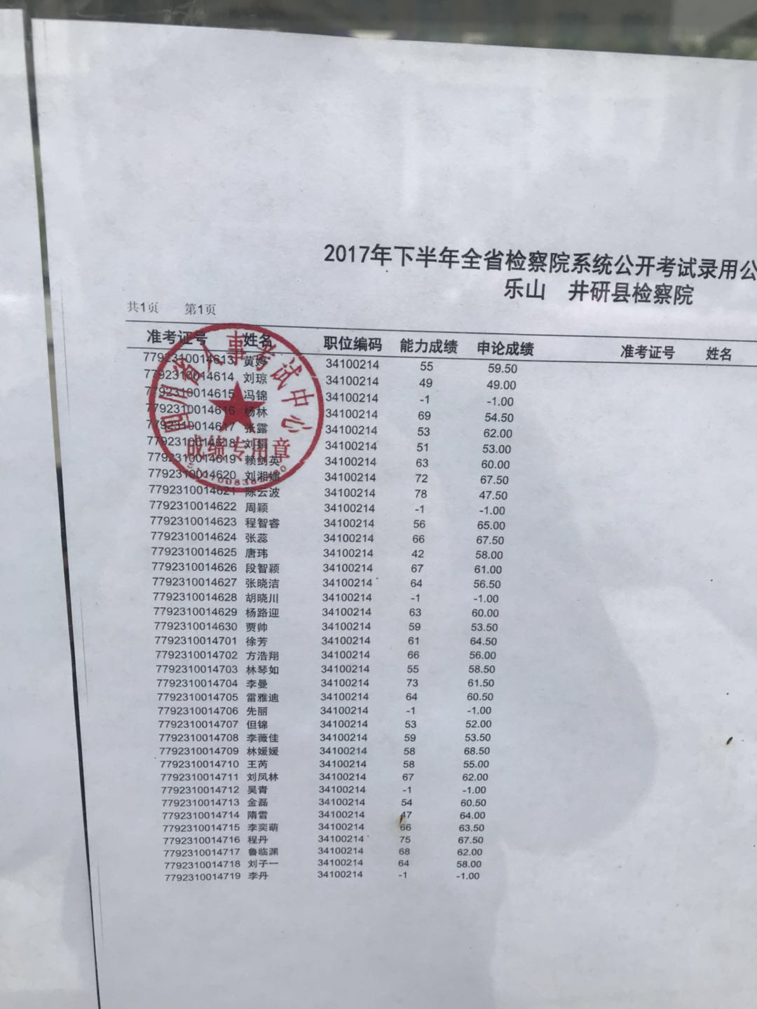 2017下半年乐山公务员考试检察院系统笔试排名表_资格复审名单